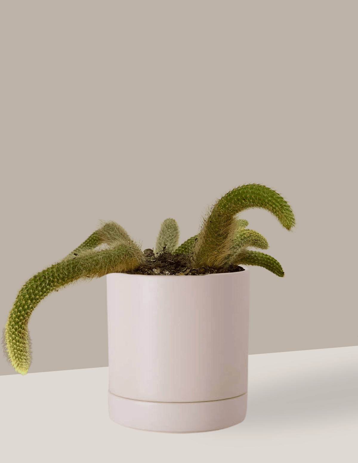 Folhagem: Sua estrutura é formada por caules cilíndricos e pendentes, cobertos por uma densa camada de espinhos finos e brancos, que dão a ele um aspecto macio e aveludado. Esses espinhos ajudam a proteger a planta e também a reduzir a perda de água, uma adaptação típica de cactos que vivem em climas secos.