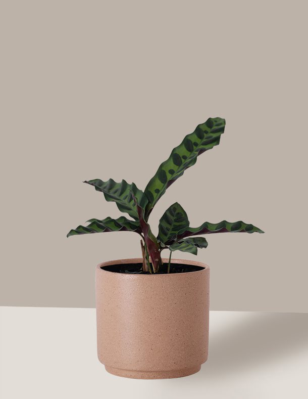 As impressionantes folhas da Maranta Cascavel são multicoloridas em junção com suas partes inferiores roxas tornam esta rara calathea uma planta de casa exótica e muito atraente.